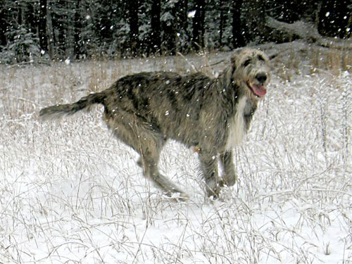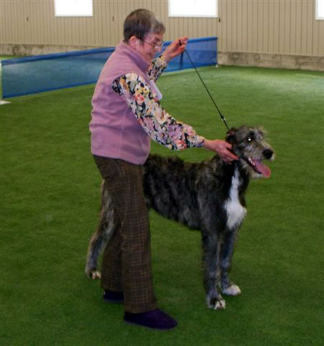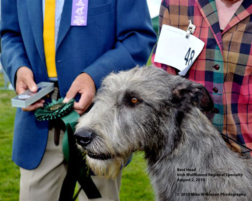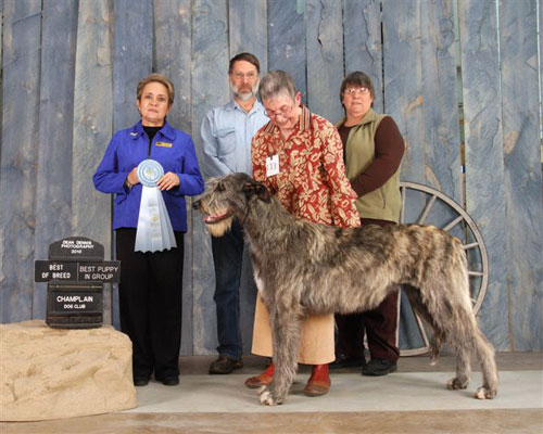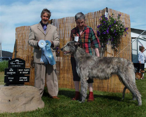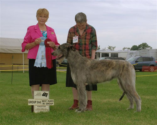 At her very first show at just 6 months of age Pokere quickly proved she was a natural "show girl". At an all breed Sanction Match in Hudson Quebecon the 31 January 2010 she got off to a flying start with 2nd in the Bitches division of an all breeds combined Puppy Sweepstakes, then on the Winners Bitch over adults in the Regular IW classes, and Best Puppy in Breed and Group. She quickly finished her Championship from the puppy classes with 2 adult Group placements and 4 Best Puppy in Group wins in 2010. Also some nice Specialty class wins at IWANE in Warwick RI, USA, and at the IWCC National. She also won the 14th Best Head Class for the Aotearoa Irish Wolfhounds at IWANE in July 2010 under Irish breeder Judge Anthony Killykeen Doyle, a win to be cherished as he passed away not long after this show.