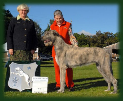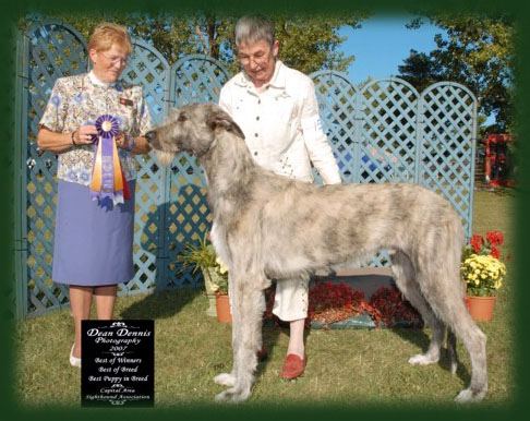 Throughout the remainder of 2007 Salt continued to impress judges in both Canada and the USA at IW Specialties and All Breed shows. While still a junior puppy he took his first 3 Championship points going Best of Breed, Best of Winners, and Best Puppy over an entry of 8 mostly adults including a Champion, under Sighthound specialist Pamela Bruce. One week later, at just 9 months he took the same wins again at the Capital Area Sighthound Association Specialty over a similar entry under Scottish Deerhound fancier Sandra Anderson, pictured below.