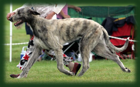 This exciting Manuka son made his show ring debut with a flourish at the IWANE Specialty in Warwick, RI USA 29 July 2007, winning both 6 to 9 month puppy male classes, Sweeps and Regular, and on to Reserve Winners Dog."His flawless movement gave him the edge" said breeder.judge Jette Holm Jensen from Denmark, over his half brothers, also Manuka sons, 6 month old Aotearoa Oldline Freehold Moa who placed second in the regular 6 to 9 month puppy class, Can Ch, Royeljoker's Tiger on the Loose, who won the Open male class and Best Head at this show, and an All Breed Best in Show winner in Canada, and 50+ other mostly adult male IWs. I am very grateful to Alan MacLeod for handling Salt in the classes while I stayed with "baby" Moa. For Winners Dog I had take over with Salt and I had a hard time keeping up with him. See the 2 movement photos below.