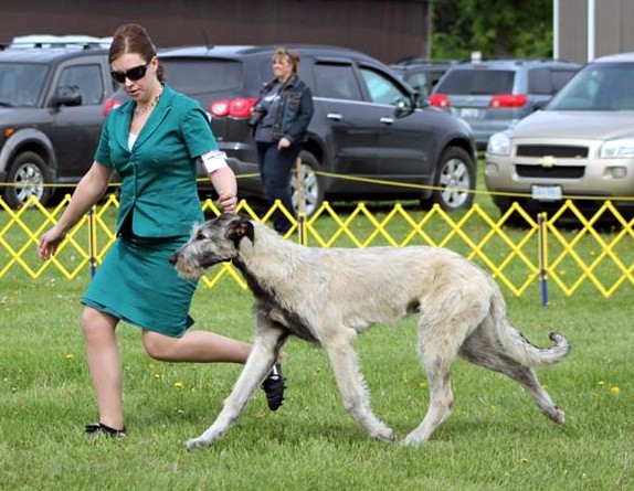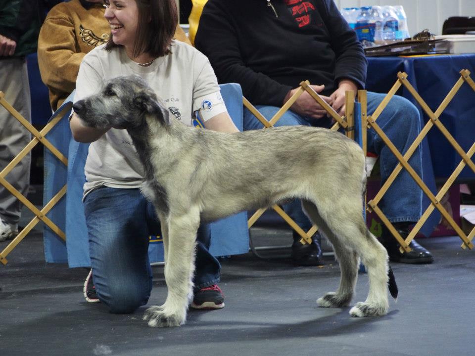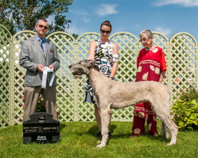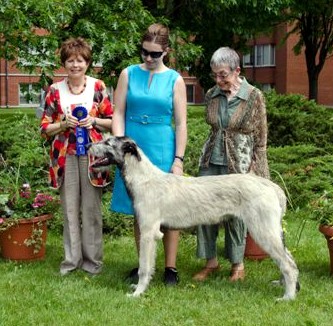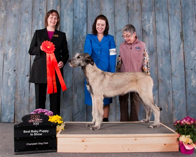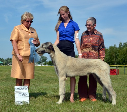 At his first Championship shows at the Champlain KC in Petawawa Ontario Tama took Best Baby Puppy in Breed and Group all 3 days, and 2 days out of 3 BEST BABY PUPPY IN SHOW!!! More Best Baby Puppy in Breed and Group followed, with comments from some judges he would have taken the breed over adults present if he had been over 6 months. After he turned 6 months he did just that many times to finish his Championship before 10 months of age. With 7 Best Puppy in Group awards and several adult Group placements also from the puppy classes Tama finished his first year as #1 Irish Wolfhound puppy in Canada for 2013 and #16 in the adult TOP DOG placements. But Tama’s most rewarding triumph of all for me was at his final show of the year, the IWAGS Specialty in Matamoras, PA, USA where he won my own AOTEAROA trophy for Best Head und breeder/judge Els Swelheim-Kruisinga from the Netherlands, joining his many Best Head Class winning ancestors and relatives at Specialties both sides of the border over the past 30+ years.