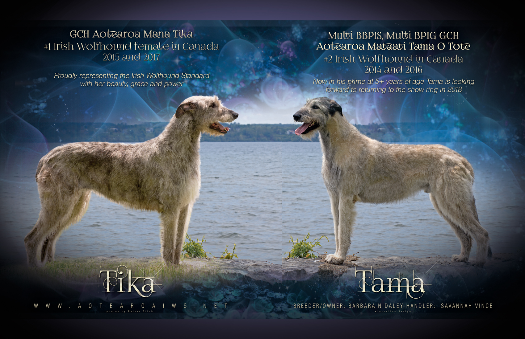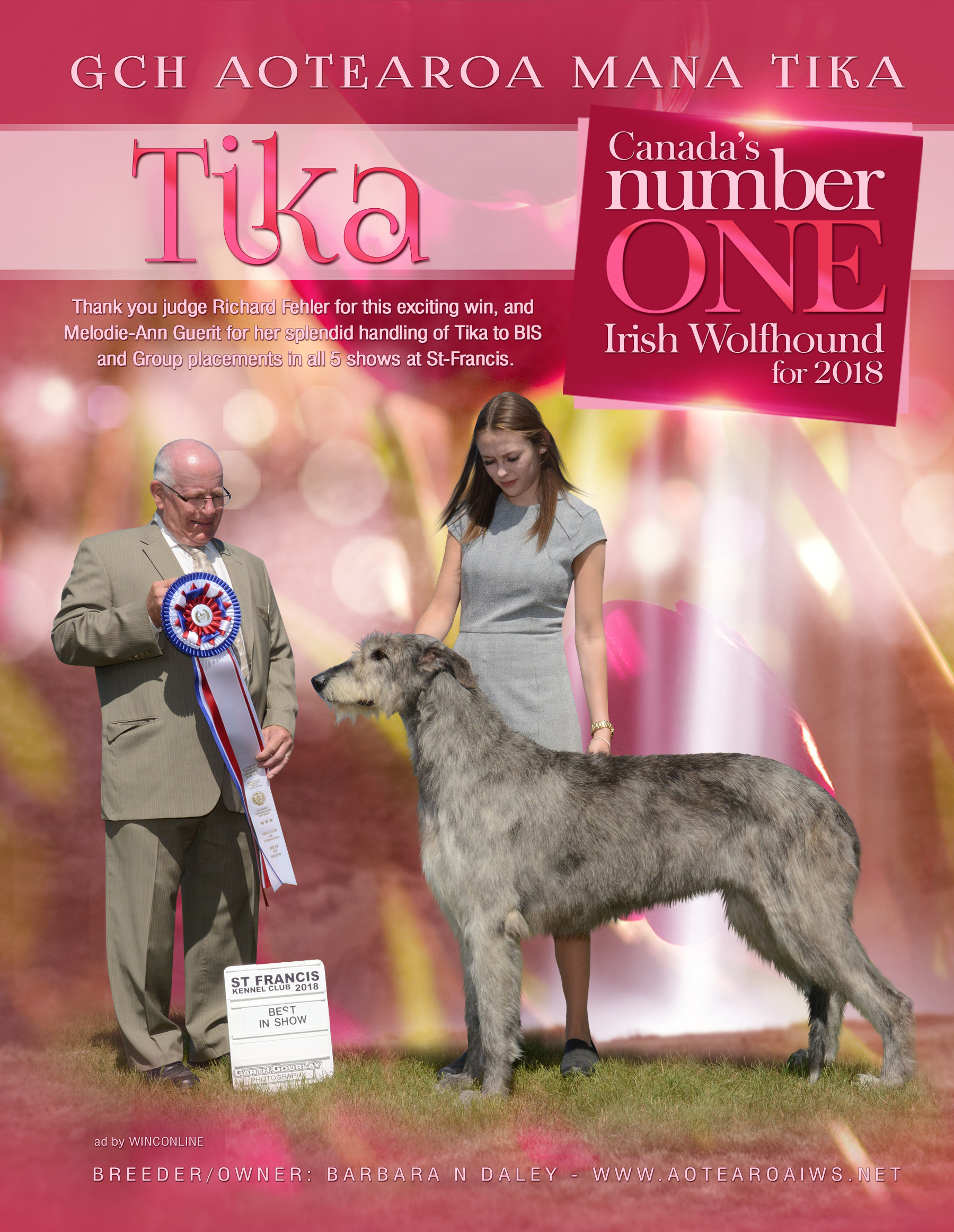 2018 has been a great year for the Aotearoa Irish Wolfhhounds, ending with littermates Tama, GCH Aotearoa Mataati Tama O Tote, and Tika, BIS GCH Aotearoa Mana Tika BOTH in the TOP 5 Irish Wolfhounds in Canada. Tika #1, and Tama #5, based on just his 6 Group placements in 2 weekends in April. To the best of my knowledge this is a first for the breed in Canada for 2 Irish Wolfhound littermates to be in the Top 5 in the same year.