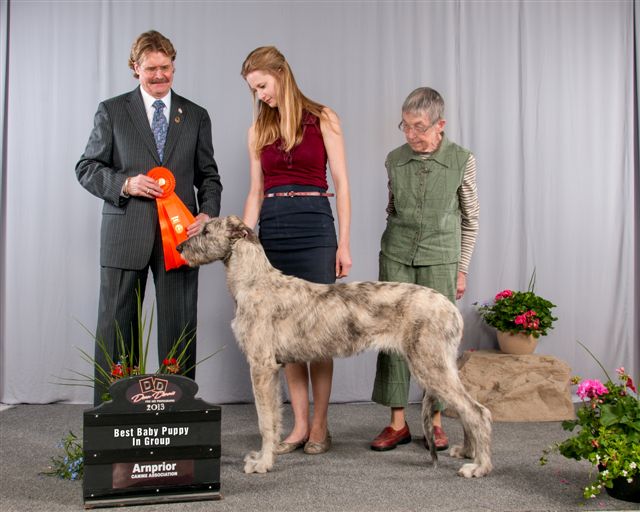 At first Tika was very much in the shadow of her precocious brother. Nobody seemed very interested in her, all eyes , wins and praise were for Tama. She felt the lack of attention too, and showed it by grabbing the stuffed toys he won for Best Baby Puppy as he came out of the ring, and not wanting to give them back! Then gradually she started to beat him more often as time went by, not only taking Best Puppy in Breed over her brother, but going to on to 3 Best Puppy in Group wins to finish the year as #4 Irish Wolfhound puppy in Canada for 2013. Tika finished her Championship from the puppy classes with Best of Breed wins over adults also, including a Multi Best in Show winning Champion Special, something her brother has not done...yet! Tika has been beautifully handled mostly by Savannah Vince, who she ADORES, and occasionally by Christine Pollen.