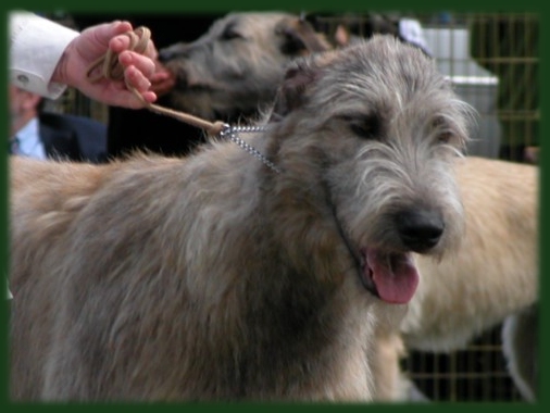 Judges' critiques: "Lovely wheaten brindle of 9 months old, with a pleasing head and expression, nicely folded ears, good forechest, lovely outline and curvy rear. Correct rise over loin, moved out and used all he had while moving round the ring." Puppy Sweepstakes breeder / judge Emma Ross.