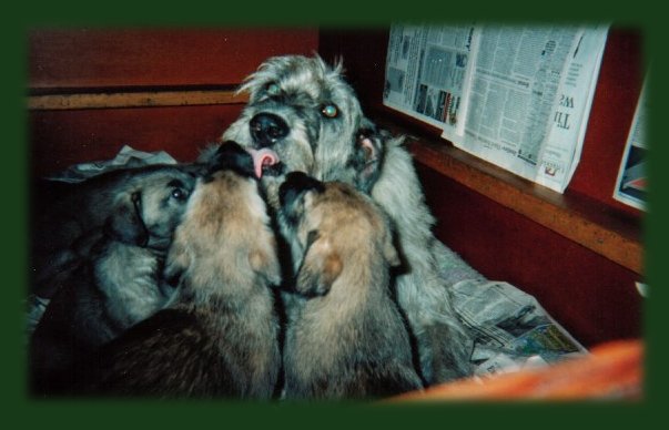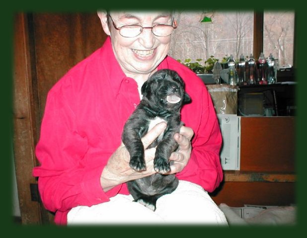 Here is Chelsey, (Can.Ch. Locksley's Wild Chelsey) with all her litter of 5, including Monster girl, and 2 black girls.